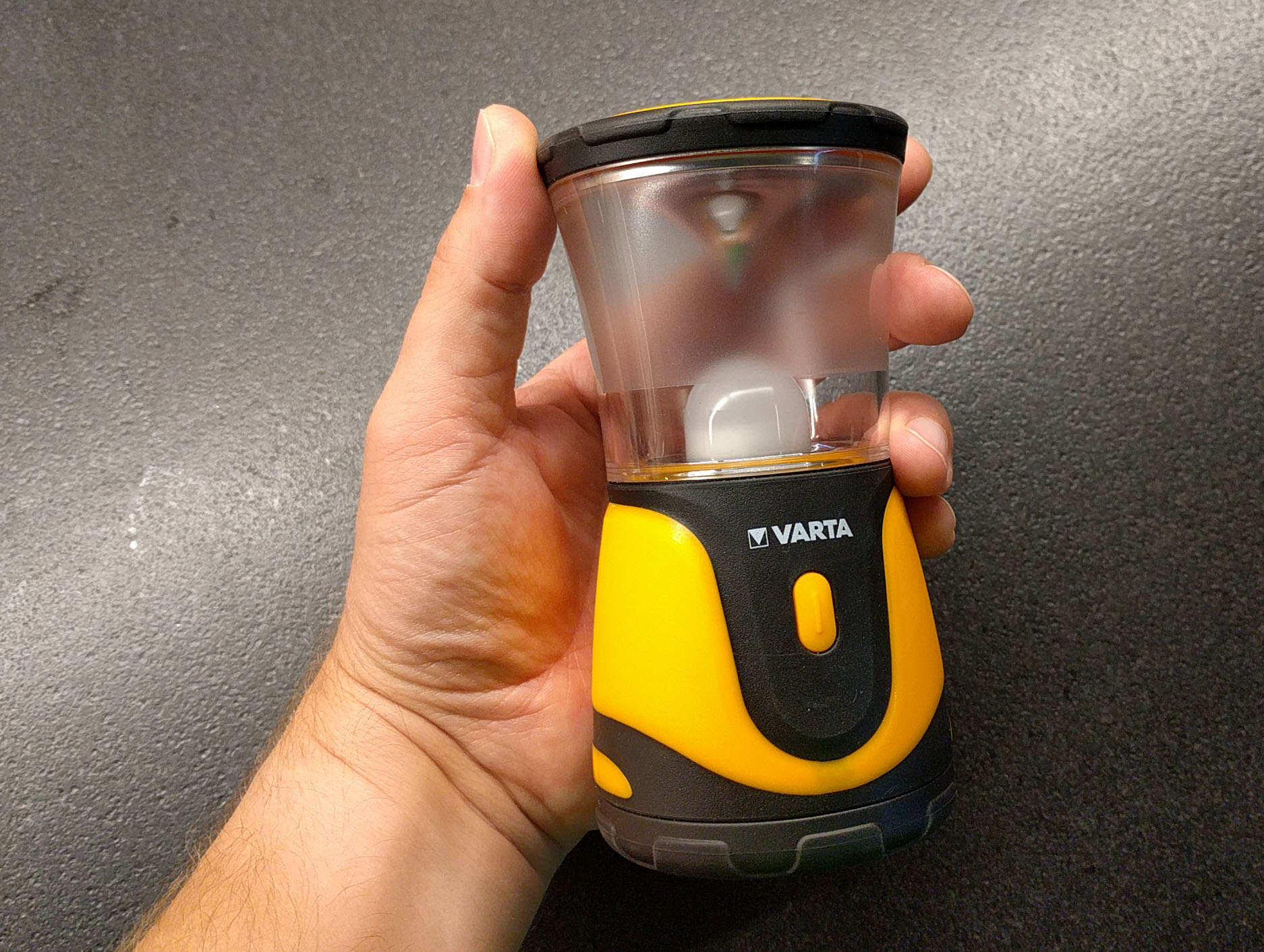 Alle Gehäuseabschlüsse sind mit dämpfenden Gummirändern versehen, sodass ein versehentliches Hinunterfallen der Lampe kaum was anhaben kann. Auch Spritzwasser macht den beiden Varta Outdoor Sports Lantern nichts aus. Sowohl an der Ober- als auch an der Unterseite lassen sich die Lampen recht einfach aufhängen und im aufgehängten Zustand kann man das transparente auch Oberteil abschrauben, sodass man ein besseres Bodenlicht erhält. Ein/Aus und dimmen erfolgt über einen gut greifbaren Druckknopf, den man auch in der völligen Finsternis schnell ertastet.